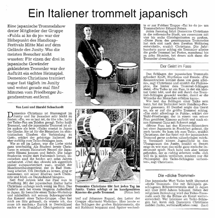 Angefangen bei Kurinoki Wadaiko Frankfurt im Jahre 2011 stieß D. Cristiano im Jahre 2013 zu uns. Eine gute Mischung aus Ehrgeiz, regelmäßigem Training, sowie mehrere Aufenthalte in Japan mit Unterricht bei renomierten Lehrern (Tanz, Gesang, Flöte und Taiko) autorisieren ihn als ordentliches Mitglied des FTD auch zur Anleitung eines Trainingskurses in unserem Dojo.